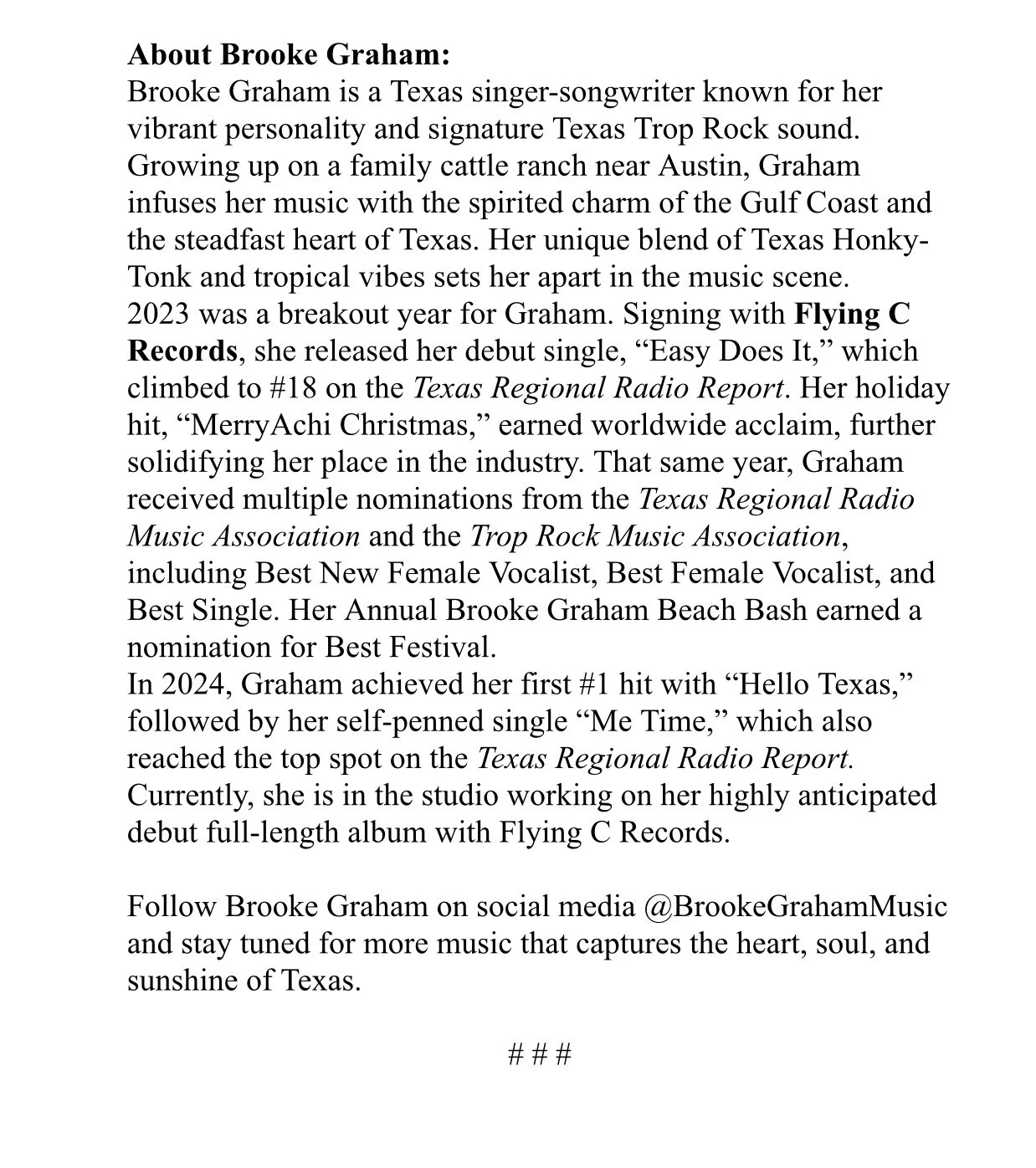 Texas Trop Rock Queen Brooke Graham Set to Shine at Meeting of the Minds Nashville, TN - October 18, 2023 - “Texas Trop Rock Queen” Brooke Graham is poised to take the stage at The Gulf, Orange Beach, AL, headlining the Flying C Records Showcase on Sunday, October 29, 2023, at 2:30 pm, as part of the iconic Meeting of the Minds event. This annual Parrot Head Convention draws legions of Jimmy Buffett enthusiasts worldwide, celebrating the music and lifestyle that has inspired a genre known as Trop Rock. This vibrant genre, with its sun-soaked rhythms and island-infused melodies, continues to captivate audiences. Brooke Graham, a rising figure in the Trop Rock scene, has received notable nominations from the Trop Rock Music Association. Her summer anthem, “Easy Does It,” has earned nods for Best Single and Best Video, while Brooke herself is in the running for the esteemed Horizon Award. The awards ceremony is scheduled for Thursday, Oct. 26, 2023. Brooke’s journey from a farm upbringing to becoming the Texas Trop Rock Queen is a testament to her talent and unwavering dedication. Collaborating closely with acclaimed producers Jimmy Collins and David Norris, Brooke continues to shape her musical identity, blending her distinct style with their seasoned expertise.